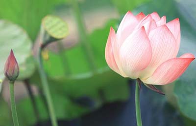 18、来到池塘边,荷花一株株挺立在那儿,它们姿态各异,有的含苞待放,有的张开了两三片花瓣,有的全部盛开了,有的似亭亭玉立的少女